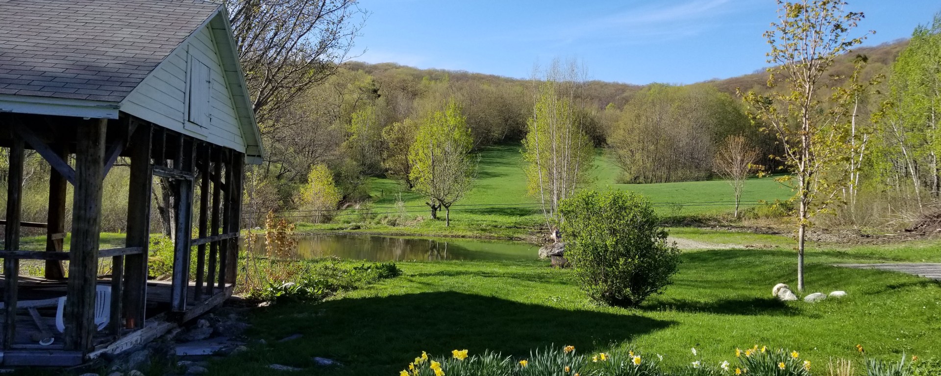 Work began in May 2018 to tear down the old shed and continued through June and July. It was exciting to see the views open up as the shed was coming down. The shed had completely blocked our views to the back. But as these photos show, we can now enjoy the gorgeous scenery from the house and sit on porch and see across to the new pond and fields beyond.